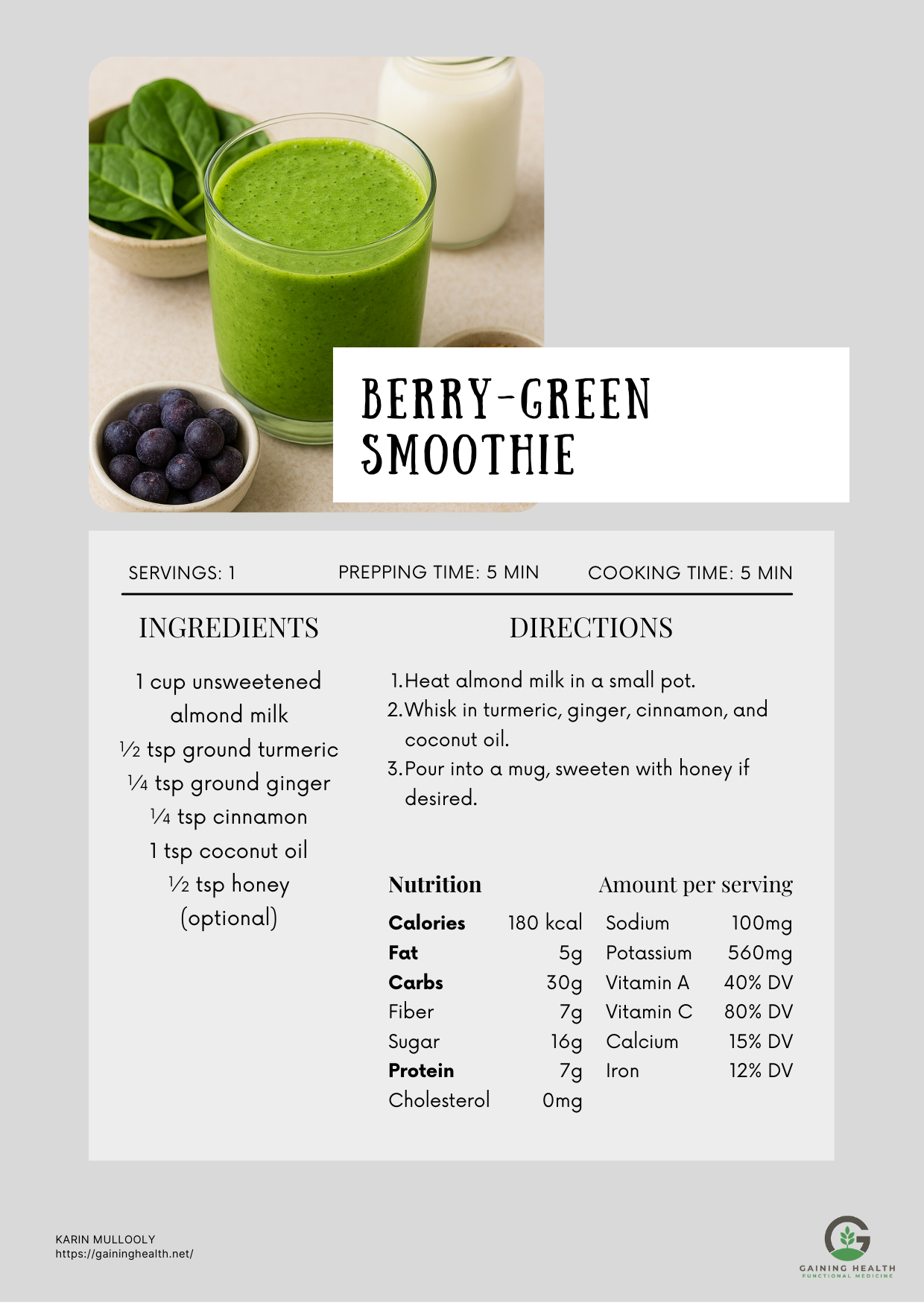 Packed with antioxidant-rich berries and leafy greens, this smoothie is a refreshing way to start or recharge your day. Berries are linked to sharper memory and slower cognitive decline, while greens deliver folate and magnesium for stress resilience. Adding flax or chia seeds boosts omega-3s, further supporting brain health. It’s a simple yet powerful drink for busy fall schedules.