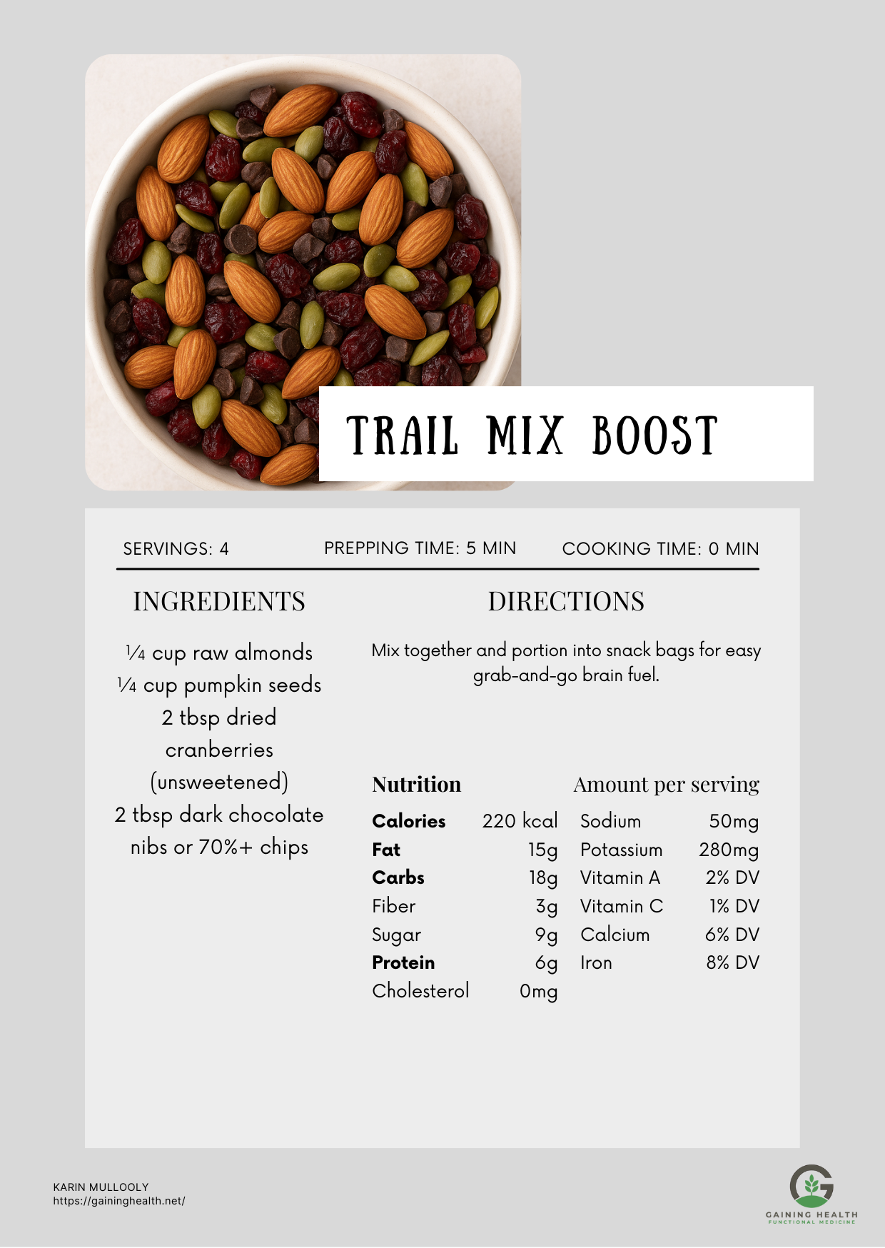 Cognitive Resilience: A mix of nuts (walnuts, almonds, cashews) supplies omega-3s, vitamin E, and polyphenols, all linked to reduced cognitive decline.